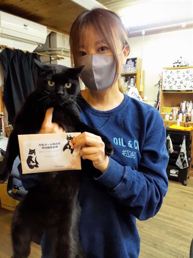 四条オール商店街地域猫募金の募金箱が設置されておりますお店、パンダ美容室さんへお伺いさせて頂き募金、寄付金の受渡し無事完了いたしました🙇‍♀️