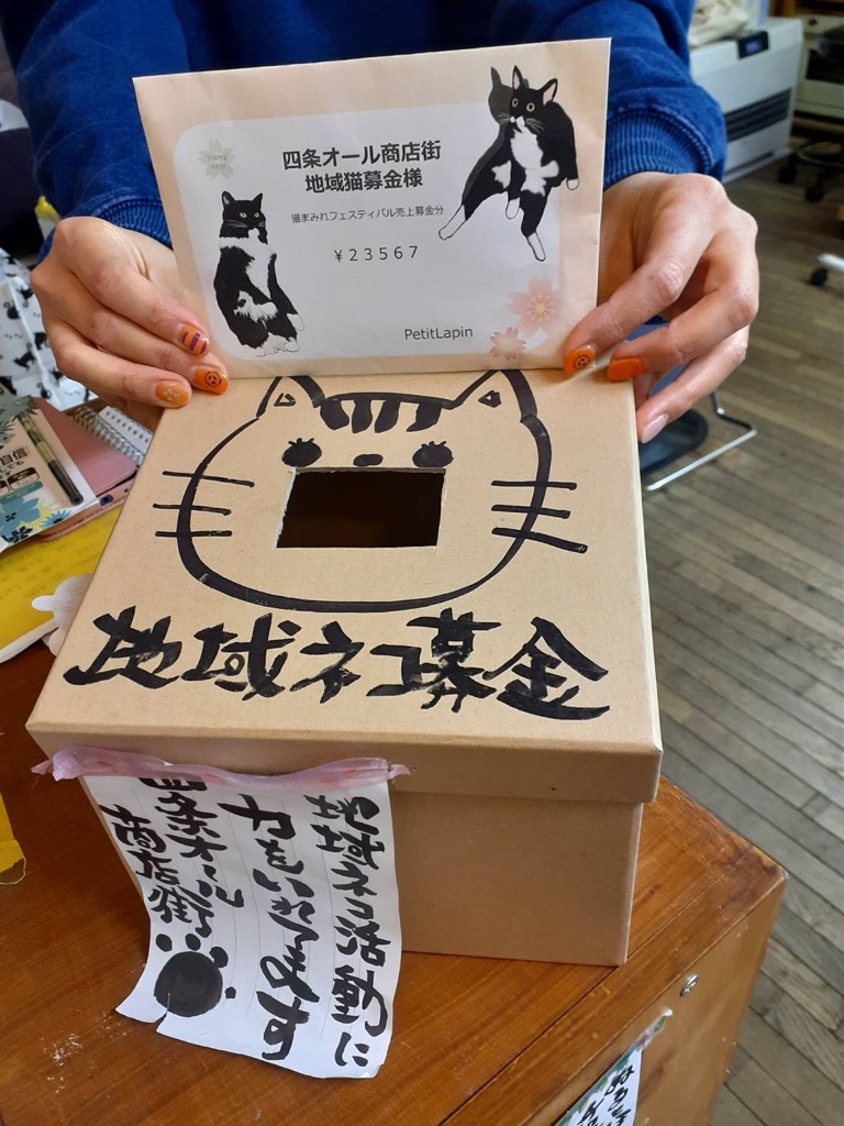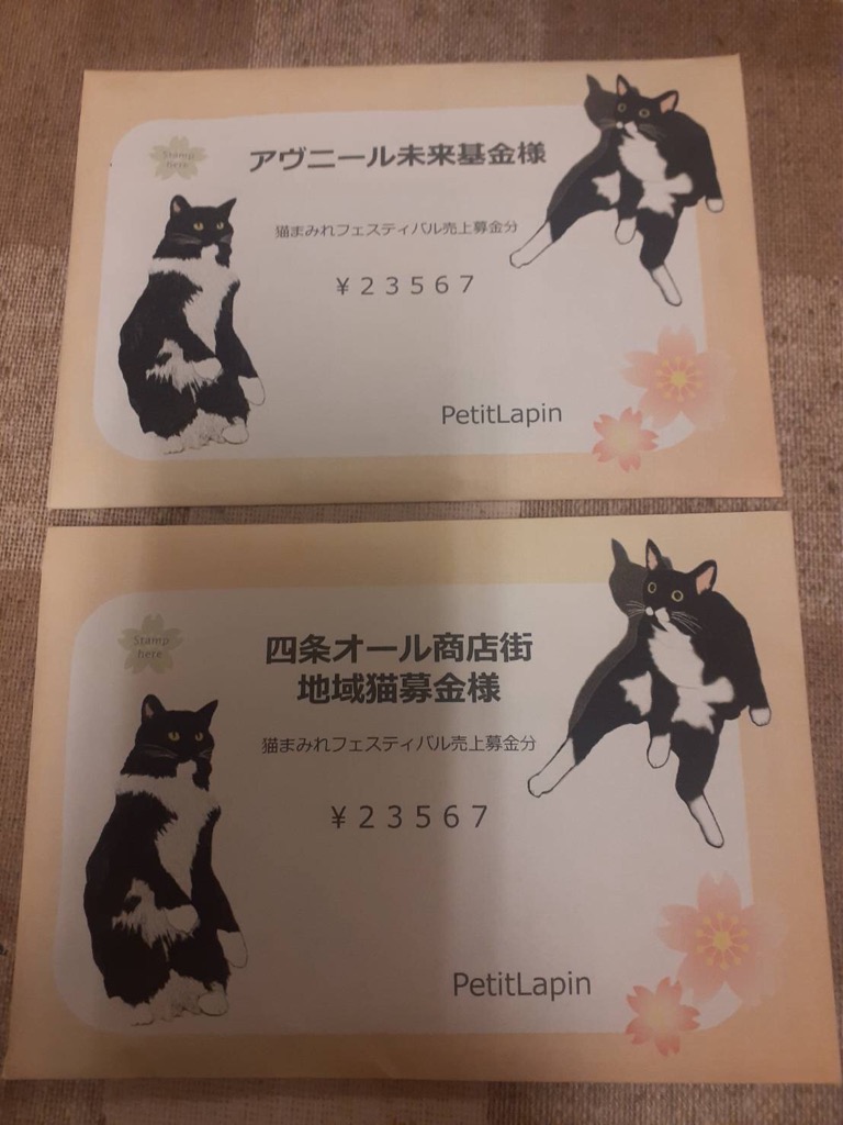 改めまして今回、猫まみれフェスティバルへたくさんの皆様のご来店がありましたことでこのように四条オール商店街地域猫募金さんとアヴニール未来基金さんに寄付金をお渡しすることができました、ご来場下さいましたお客様にはこの場を借りまして再度お礼を申し上げます🙇‍♀️