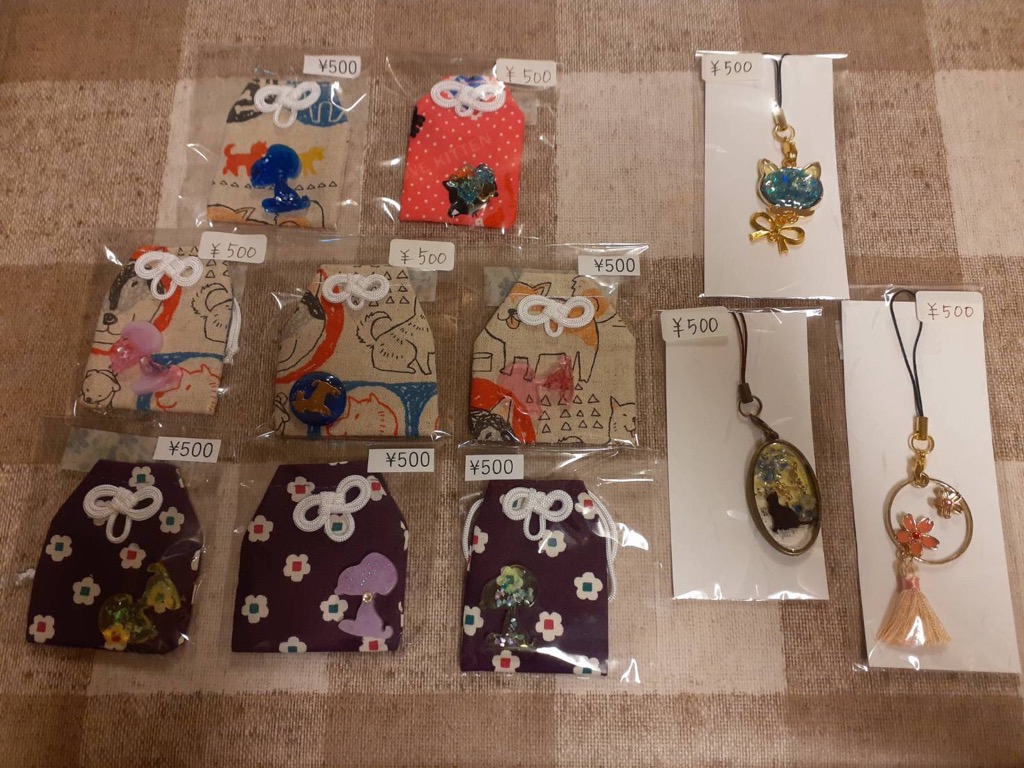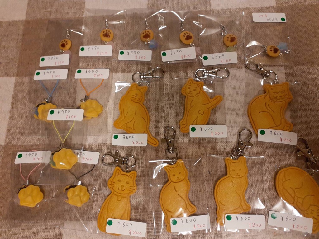 当店店主が製作した樹脂粘土製の猫型クッキー風ストラップや肉球🐾クッキーのマスクチャーム、マグネットなども販売します✨