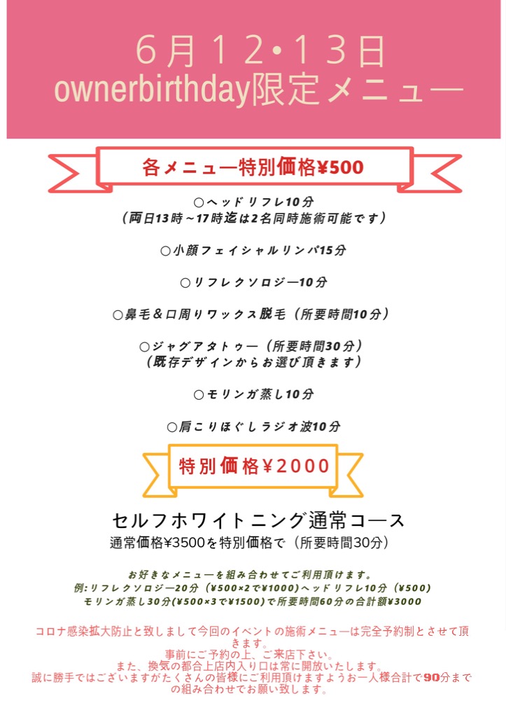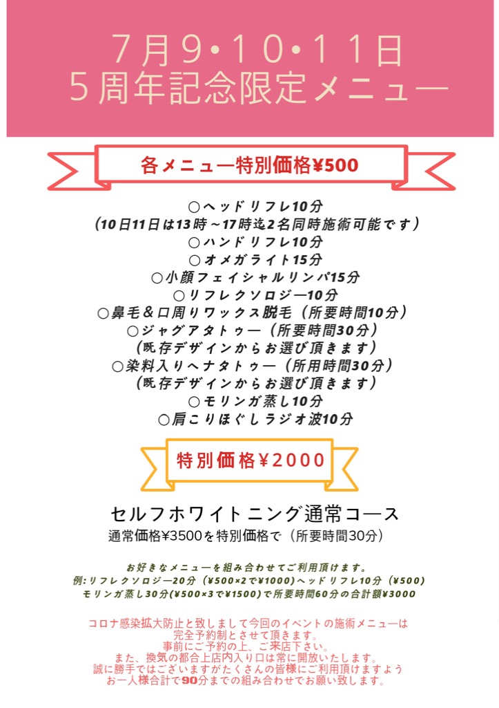 施術は完全予約制になります、当日ご予約も可能です🎵イベント施術メニューの詳細は画像をご確認下さい☆