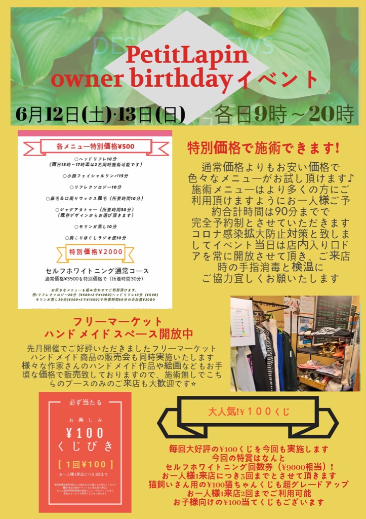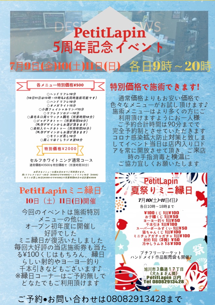 プチプラメニューは9日、10日、11日の3日間開催、ミニ縁日は10日、11日の2日間の開催です。施術につきましては先月のイベント同様スタッフ増員の2人体制にて対応させていただます✨😌✨