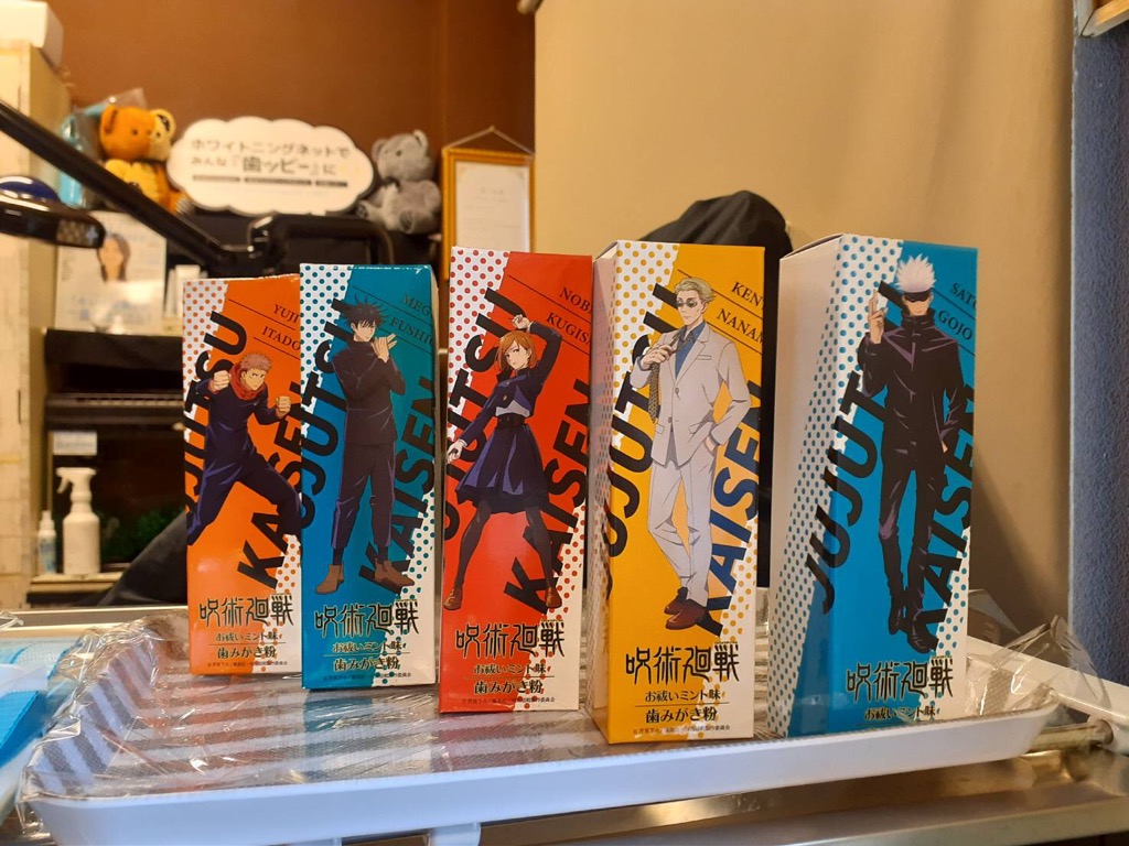 現在、セルフホワイトニングの機器のメーカーさんが数量限定にて『呪術廻戦(じゅじゅつかいせん)』とコラボレーションしたオーラルケア商品を発売しており、お客様のご要望もあり当店でも少量ではありますが入荷・販売開始いたしました❗